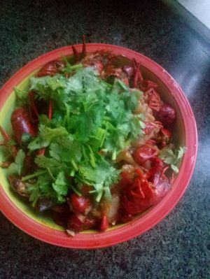 待确定小龙虾熟了之后收汁,加入香菜段,翻炒一下即可起锅,可以加入一些青椒配菜。香香的小龙虾就可以开动了