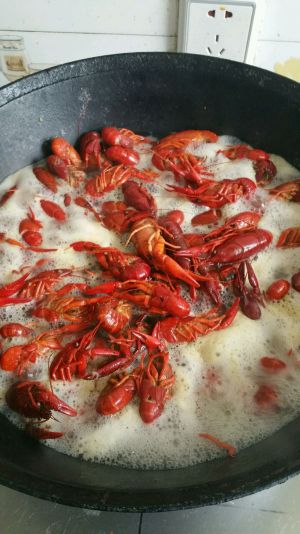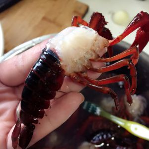 水烧开后把小龙虾倒入,半分钟后捞出,为了卫生,我琢磨水烧开后倒入可以保持肉质的弹性!
