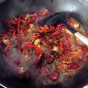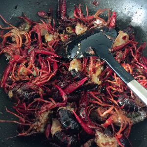 加油,倒入配料,炒香,放入小龙虾翻炒