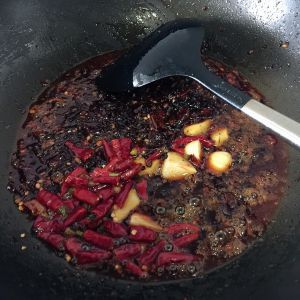 热锅热油加豆瓣酱炒出红油之后,加入姜、蒜、花椒、干辣椒、八角、桂皮、草果、茴香等大料爆香