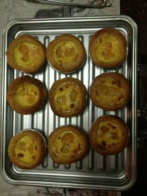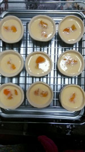 在蛋挞皮内放入蛋挞液(不用太多8成满足够)和黄桃丁(放的数量按口味来)