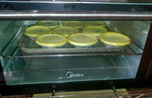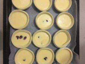 蛋挞液稍微凝固,打开烤箱放入蜜红豆。