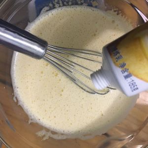 加糖后的奶液完全放凉后,打三个蛋黄进去。