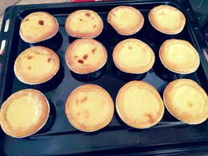 倒入蛋挞水,8分满,烤箱预热陈10分钟,放入烤箱中,上下管,220°中层,25分钟。