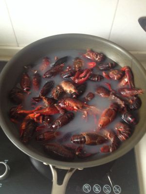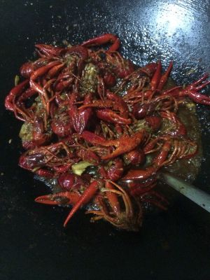 倒入小龙虾,大火上下翻炒,炒至龙虾壳变红,加入凉白开没过小龙虾,再加入料酒,味极鲜酱油,盐,糖,十三香。大火致水烧开,改中火盖上锅盖焖15分钟,过程中可以不时掀开锅盖上下翻动一下龙虾。(此步骤种水和料酒可以用啤酒代替,但啤酒一定要选清甜口味的)