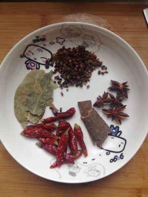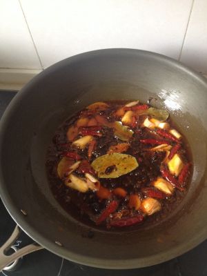 放油,以此加入花椒大料葱姜蒜辣椒,炸香,放入豆豉~