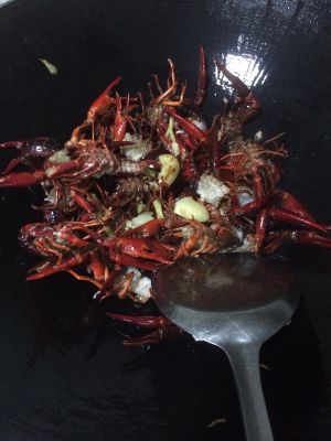 3、热锅下油,油热后,倒入一半配料,再倒入小龙虾翻炒,再把所有配料都倒入,翻炒。撒盐,倒酱油,撒少许干辣椒,花椒,鸡精,翻炒,倒点水或者酒,装盘,起锅。