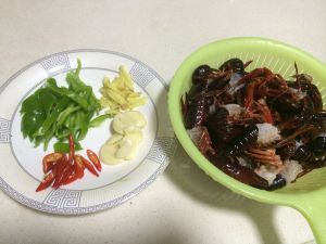 龙虾清刷干净,去掉虾线,辣椒切段,生姜大蒜切片
