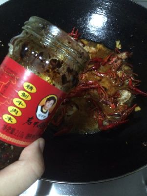 油锅下小龙虾~加入白糖。炒香。下花椒。加入老料(可以放豆瓣代替,也可以拿火锅料代替)继续炒。