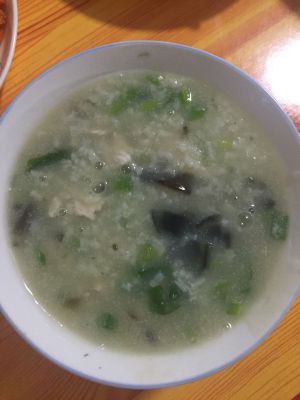 一碗美味的皮蛋瘦肉粥就出来了。大家也可以加入一些韭菜代替香葱。希望大家适着自己动手做饭,慢慢的会爱上这个过程和结果。