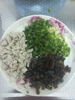 皮蛋剥好洗净,加清水和少许料酒煮开,再煮两三分钟,取出过凉水,切成小粒备用,切好小葱、姜片或姜丝备用