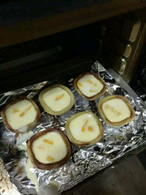 烤箱预热,上下火230度,将烤盘装上蛋挞坯放入预热好的烤箱中层,烘烤20分钟。