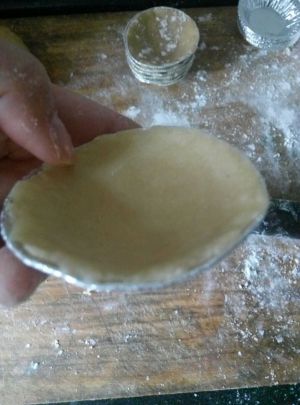 最后把面皮擀成薄片,然后卷起(感觉像做烧饼一样),切成同等的小份,擀成饺子皮样,放入蛋挞模具中,即可。(切成小份后,也可以用手在模具中按压即可。)厚度比饺子皮稍厚即可。