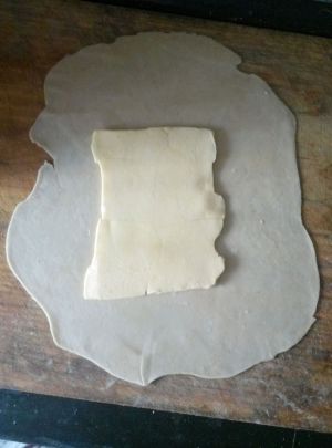 十五分钟到后,把面团取出,把它擀成大一些薄一些的面皮,然后把要裹入面皮的黄油擀成比面皮小一半的黄油片。(黄油一定要装进食用袋中,或是保鲜膜中擀。)