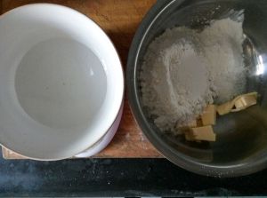 黄油软化后,加入低粉、高粉、盐、白糖,用手揉搓,然后每次少量的加入水,揉至成面团,装进干净的食用袋中系好,放入冰箱冷藏十五分钟。