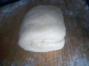 把黄油放到面皮的中间,用面皮把它包裹住,用擀面杖把面皮擀平,排气。记着擀前,一定要在案板上撒上面粉。
