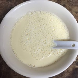 淡奶油纯牛奶白糖鸡蛋低粉混合搅拌(各类材料用量可根据个人口味稍作调整,我这个不是特别甜,而且有些朋友是不用低粉的。)