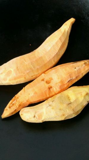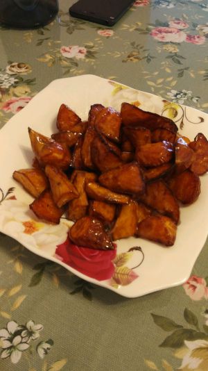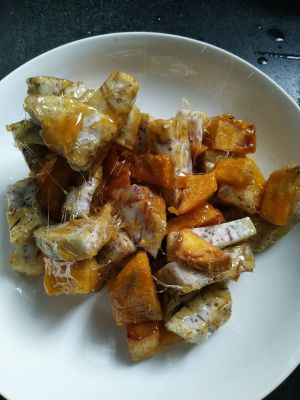 糖炒化,加入红薯,褐色是红糖,颜色没有白糖的好看感觉边上颜色有点深,但是味道很好。