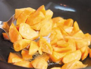 迅速将熟地瓜放入锅中翻炒,待糖将地瓜翻炒均匀