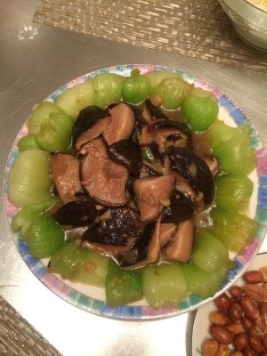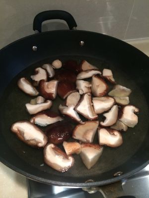 油热爆香蒜末,倒入香菇翻炒,加老抽、生抽、耗油、糖、盐~
