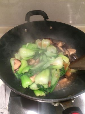 起火下油预热,香菇下锅翻遍,加一铲勺蚝油,两汤勺生抽,两茶勺糖后继续翻遍,最后加入水淀粉勾芡起锅。