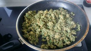 放入香椿蛋液,翻炒至半干略湿的状态时盛出,此时的口感最佳