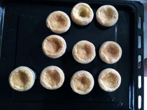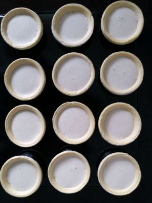 冷藏后取出分成相等分的若干小团.把小团放在挞模里双手拇指随着模具推成底薄、边稍厚的挞皮。
