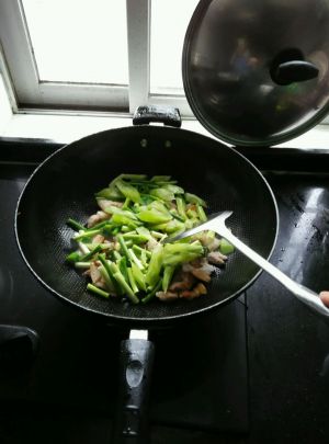 下葱蒜炒香,下尖椒,翻炒几下,下肉片,烹入少许老抽、适量生抽,加盐,翻炒均匀,汤汁收紧即可