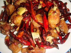 锅里烧油至7层热,倒入姜蒜炒出香味后倒入干辣椒和花椒,翻炒至气味开始呛鼻,油变黄后倒入炸好的鸡块。