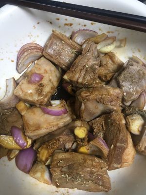 盐,老抽,料酒,黑胡椒粉,元葱切碎,腌制羊排40分钟。