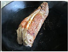 铸铁平底锅大火加热至冒烟,放入羊排煎至两面金黄。如果羊排像我这样比较厚的话,最后各面都煎一下。