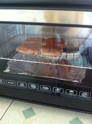 20分钟后刷上蜂蜜,翻面再烤制10分钟!烤盘用锡箔纸来接油 用烤架烤可以充分烤去多余的油脂而且两面都是脆皮的哦!