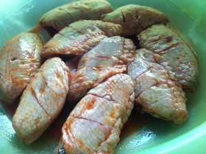 翅膀吃根划几刀,在调好的酱料(粉:水=1:1)里腌制一个晚上