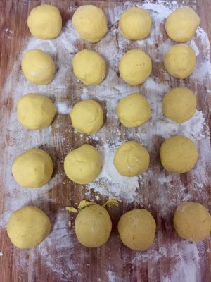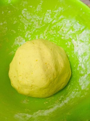 牛奶温热(不烫手即可)加入酵母,然后倒入温温的南瓜泥中,面粉少量多次拌入南瓜泥中,用硅胶铲和成软的面团