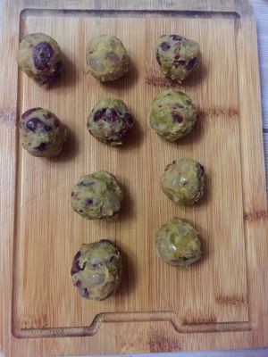 将馅放进南瓜面团中,按压成饼,用牙签压出纹路、南瓜饼get!葡萄干的是蜜豆南瓜饼,黄色芒果干的是黑芝麻馅。