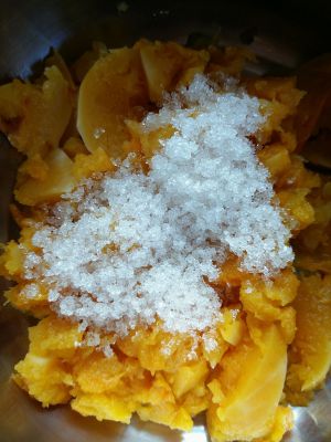 加白糖捣碎,若南瓜本身比较甜白糖就少放点