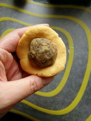 把饧i好的面团分成小胚子包入豆少搓圆压成饼状