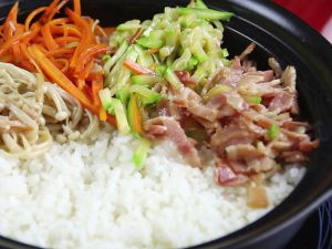 将焖好的米饭按个人饭量铺在锅底,注意要在锅底刷一层色拉油,防止糊底!将蒸好的蔬菜肉丝码放在米饭上。