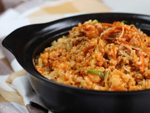 取石锅,在石锅底部刷一层橄榄油,利于米饭底部一层变成锅巴,不喜欢吃锅巴的可以省去这一步哈。 把煮好的米饭盛入石锅中,压实。