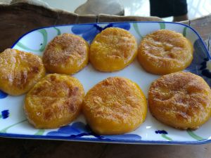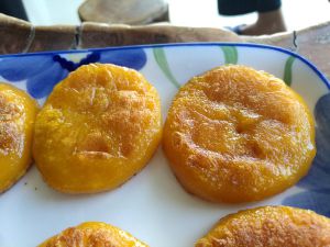 一碟色香味俱全的南瓜饼就大功告成了,吃不完放冰箱,要吃时拿出来煎一下就可以吃。