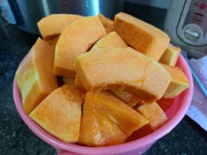 老南瓜切块,放入锅中隔水蒸10-15分钟!