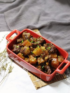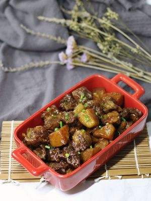 葱姜蒜切碎,放入油锅炝锅,然后放牛肉,干煸。放料酒,生抽,然后倒大半碗水,开小火焖,焖15分钟以后倒入炸过的土豆,再焖10分钟就差不多啦!
