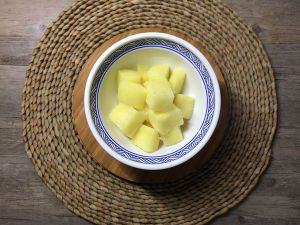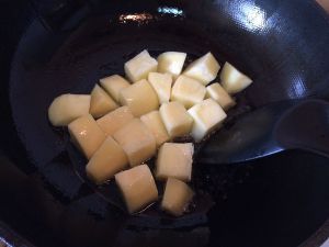 放少许油,小火把土豆块煎成两面略黄。出锅备用。