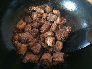 加入盐、生抽、红烧汁、糖,翻炒至牛肉上色。