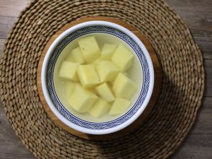 土豆去皮切块后和,先用清水浸泡半小时,中间换水一次,这样做会去除一部分淀粉。