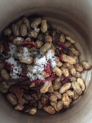 撒上两大勺盐,然后把那些配料全部倒入。加水大概和花生齐平倒在高压锅里大火烧开小火再烧10-15就好了。如果不够入味的话开盖以后再加点盐。