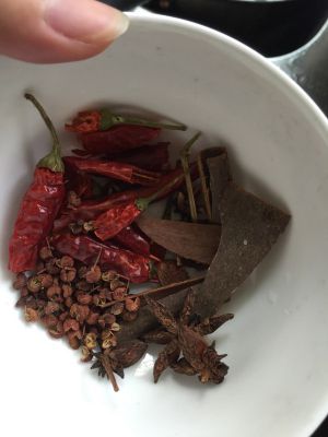 放入食用盐,八角,陈皮和花椒浸泡两小时以上,即可架锅上火。闻到香味即可。
