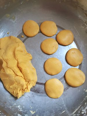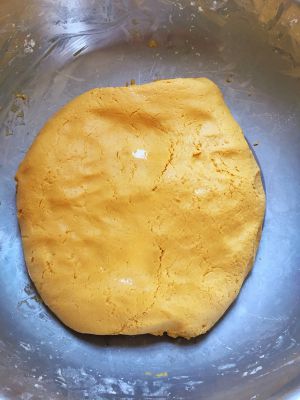 把熟透的南瓜和成南瓜泥,糯米粉一起搅拌均匀,放入适量白糖,揉成光滑面团
