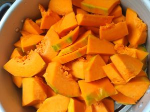 把皮削掉,切小块,上锅蒸十分钟左右,待南瓜熟透
