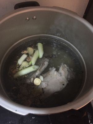 放入葱段,姜去皮不切,直接拍扁,姜一个。蒜拍扁,放入3-4个。白酒,我用二锅头。然后放入八角,丁香,桂皮,草果,香叶,小茴香,白芷,花椒粒